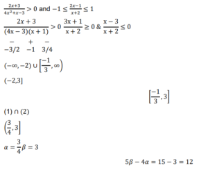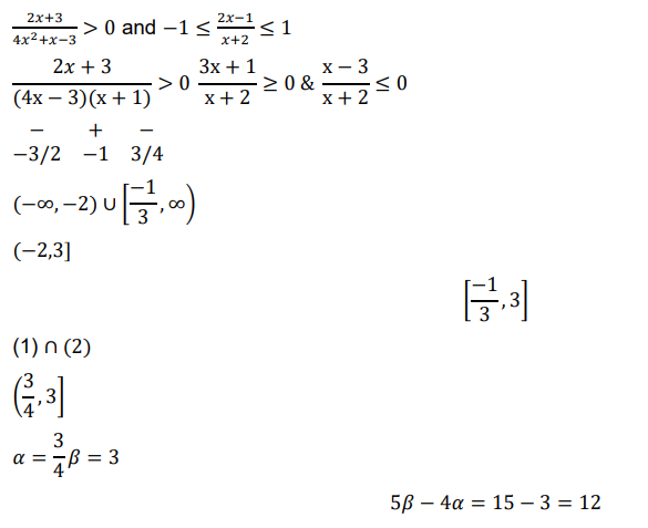 If the domain of the function $f(x)=\log _e\left(\frac{2 x+3}{4 x^2+x-3}\right)+\cos ^{-1}\left(\frac{2 x-1}{x+2}\right)$ is $(\alpha, \beta]$, then the value of $5 \beta-4 \alpha$ is equal to