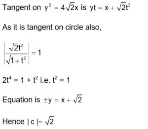 If the line $a x+y=c$, touches both the curves $x^2+y^2=1$ and $y^2=4 \sqrt{2} x$, then $|c|$ is equal to :