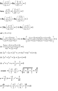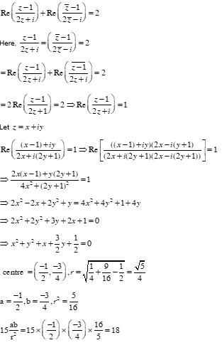 If the locus of $z \in \mathrm{C}$, such that $\operatorname{Re}\left(\frac{z-1}{2 z+i}\right)+\operatorname{Re}\left(\frac{\bar{z}-1}{2 \bar{z}-i}\right)=2$, is a circle of radius r and center $(a, b)$ then $\frac{15 a b}{r^2}$ is equal to: