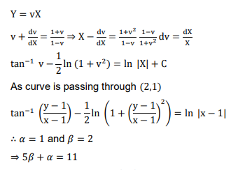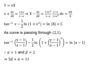 If the solution curve, of the differential equation $\frac{d y}{d x}=\frac{x+y-2}{x-y}$ passing through the point $(2,1)$ is $\tan ^{-1}\left(\frac{y-1}{x-1}\right)- \frac{1}{\beta} \log _{\mathrm{e}}\left(\alpha+\left(\frac{\mathrm{y}-1}{\mathrm{x}-1}\right)^2\right)=\log _{\mathrm{e}}|\mathrm{x}-1|$, then $5 \beta+\alpha$ is equal to