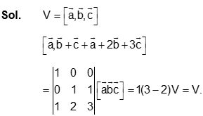 Let the vectors $\vec{a}, \vec{b}, \vec{c}$ represent three coterminous edges of a parallelopiped of volume $V$. Then the volume of the parallelopiped, whose coterminous edges are represented by $\vec{a}, \vec{b}+\vec{c}$ and $\vec{a}+2 \vec{b}+3 \vec{c}$ is equal to