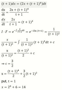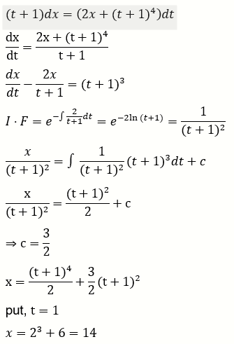 If $x=x(t)$ is the solution of the differential equation $(t+1) d x=\left(2 x+(t+1)^4\right) d t, x(0)=2$, then, $x(1)$ equals