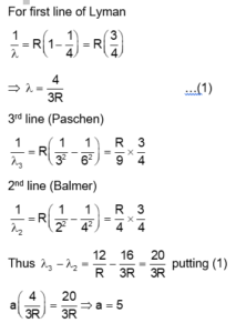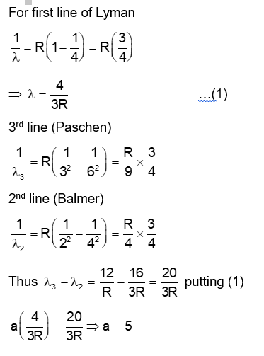 In a hydrogen spectrum, $\lambda$ be the wavelength of first transition line of Lyman series. The wavelength difference will be "a$\lambda$" between the wavelength of $3^{\text {rd }}$ transition line of Paschen series and that of $2^{\text {nd }}$ transition line of Balmer Series where a = ______