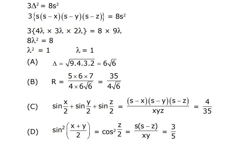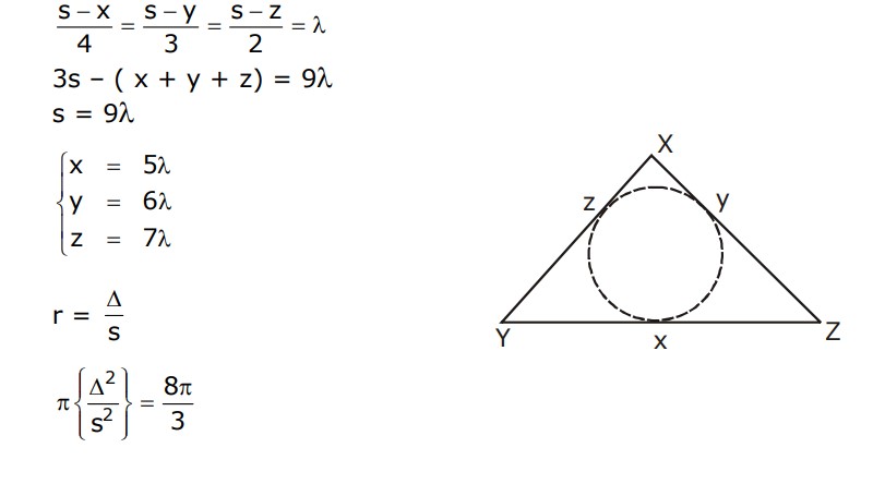 In a triangle X Y Z, let $x, y, z$ be the lengths of sides opposite to the angle $X, Y, Z$ respectively, and $2 s=x+y+z$, If $\frac{s-x}{4}=\frac{s-y}{3}=\frac{s-z}{2}$ and area of incircle of the triangle $X Y Z$ is $\frac{8 \pi}{3}$, then