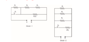 $P_1$ and $P_2$ are the power dissipations in Circuit-1 and Circuit-2 when the switches $S_1$ and $S_2$ are in open conditions, respectively. $Q_1$ and $Q_2$ are the power dissipations in Circuit-1 and Circuit-2 when the switches $S_1$ and $S_2$ are in closed conditions, respectively.