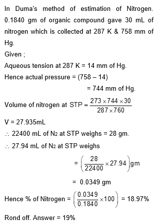 In Duma's method of estimation of nitrogen, 0.1840 g of an organic compound gave 30 mL of nitrogen collected at 287 K and 758 mm of Hg pressure. The percentage composition of nitrogen in the compound is ______. (Round off to the Nearest Integer).