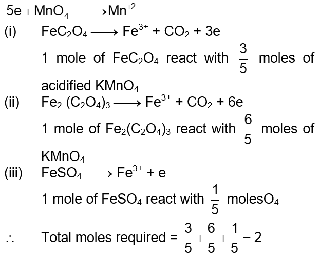 In order to oxidise a mixture of one mole of each of $\mathrm{FeC}_2 \mathrm{O}_4$, $\mathrm{Fe}_2\left(\mathrm{C}_2 \mathrm{O}_4\right)_3$, $\mathrm{FeSO}_4$ and $\mathrm{Fe}_2\left(\mathrm{SO}_4\right)_3$ in acidic medium, the number of moles of $\mathrm{KMnO}_4$ required is