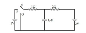 In the circuit shown below, the switch S is connected to position P for a long time so that the charge on the capacitor becomes $q_1 \mu C$. Then $S$ is switched to position $Q$. After a long time, the charge on the capacitor is $\mathrm{q}_2 \mu \mathrm{C}$.