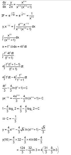 In the curve y = y (x) is the solution of the differential equation $2\left(x^2+x^{5 / 4}\right) d y-y\left(x+x^{1 / 4}\right) d x=2 x^{9 / 4}, x>0$ which passes through the point $\left(1,1-\frac{4}{3} \log _e 2\right)$ then the value of y (16) is equal to :