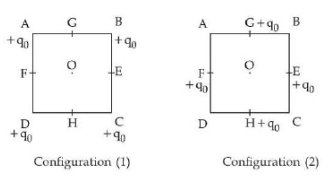 In the first configuration ( 1 ) as shown in the figure, four identical charges ( $q_{0}$ ) are kept at the corners $A, B, C$ and $D$ of square of side length ' $a$ '. In the second configuration (2), the same charges are shifted to mid points $G, E, H$ and $F$, of the square. If $K=\frac{1}{4 \pi \epsilon_{0}}$, the difference between the potential energies of configuration (2) and (1) is given by :