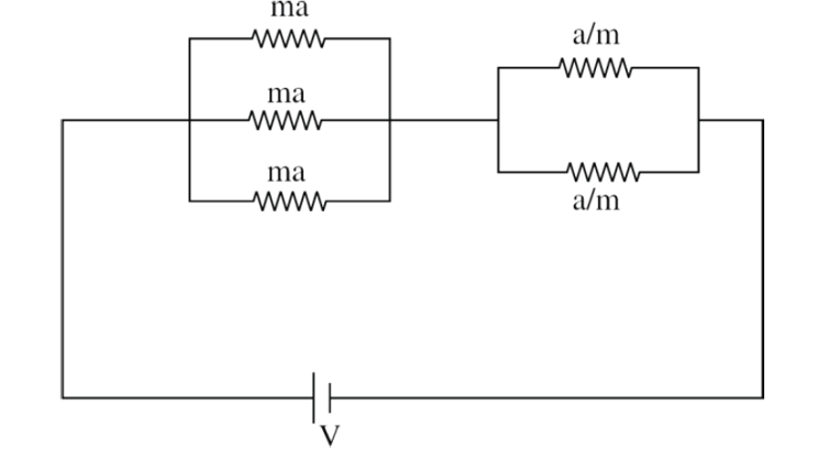 In the given circuit 'a' is an arbitrary constant. The value of m for which the equivalent circuit resistance is minimum, will be $\sqrt{\frac{x}{2}}$ . The value of x is _____ .