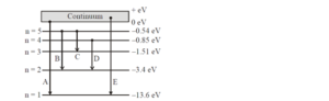 In the given figure, the energy levels of hydrogen atom have been shown along with some transitions marked A, B, C, D and E. The transitions A, B and C respectively represent :
