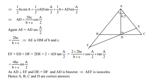 Internal bisector of $\angle \mathrm{A}$ of triangle ABC meets side BC at D . A line drawn through D perpendicular to AD intersects the side $A C$ at $E$ and the side $A B$ at $F$. If $a, b, c$ represent sides of $\triangle A B C$ then