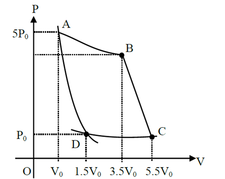 In the reported figure, there is a cyclic process ABCDA on a sample of 1 mol of a diatomic gas. The temperature of the gas during the process $\mathrm{A} \rightarrow \mathrm{B}$ and $\mathrm{C} \rightarrow \mathrm{D}$ are $\mathrm{T}_1$ and $\mathrm{T}_2\left(\mathrm{~T}_1>\mathrm{T}_2\right)$ respectively.