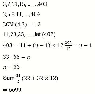 Let 3,7,11,15,….,403 and 2,5,8,11,…,404 be two arithmetic progressions. Then the sum, of the common terms in them, is equal to