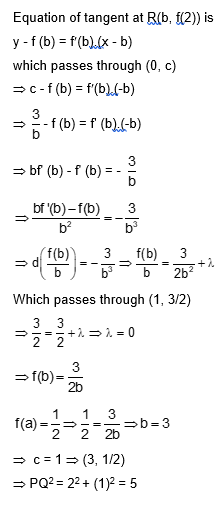 Let a curve $y=f(x), x \in(0, \infty)$ pass through the points $P\left(1, \frac{3}{2}\right)$ and $Q\left(a, \frac{1}{2}\right)$. If the tangent at any point $R(b, f(b))$ to the given curve cuts the $y$-axis at the point $S(0, c)$ such that $b c=3$, then $(P Q)^2$ is equal to