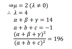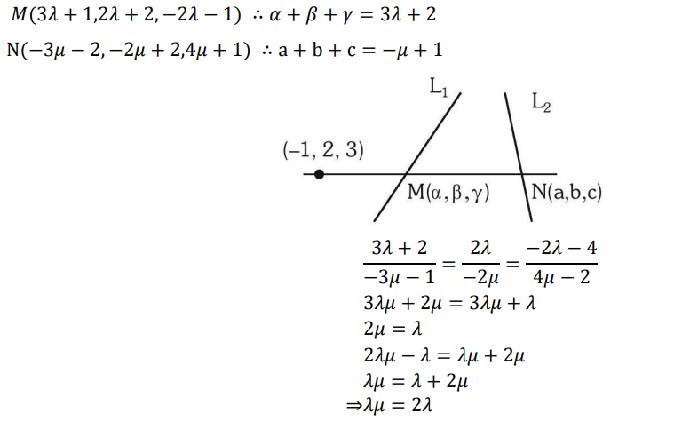 Let a line passing through the point $(-1,2,3)$ intersect the lines $\mathrm{L}_1: \frac{\mathrm{x}-1}{3}=\frac{\mathrm{y}-2}{2}=\frac{\mathrm{z}+1}{-2}$ at $M(\alpha, \beta, \gamma)$ and $L_2: \frac{x+2}{-3}=\frac{y-2}{-2}=\frac{z-1}{4}$ at $N(a, b, \mathrm{c})$. Then the value of $\frac{(\alpha+\beta+\gamma)^2}{(a+b+c)^2}$ equals