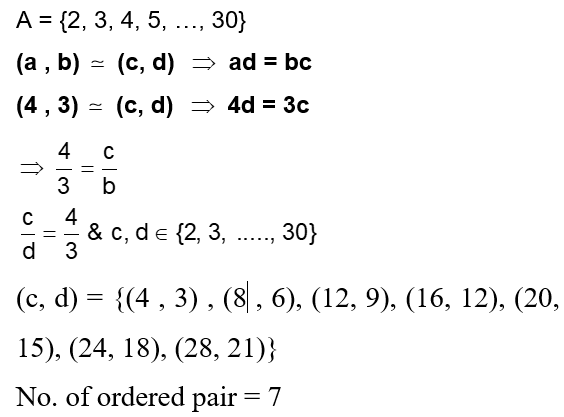 Let $A \mid=\{2,3,4,5, \ldots ., 30\}$ and ${ }^{\prime} \simeq$ ' be an equivalence relation on $\mathrm{A} \times \mathrm{A}$, defined by $(\mathrm{a}, \mathrm{b}) \simeq (\mathrm{c}, \mathrm{d})$, if and only if $\mathrm{ad}=\mathrm{bc}$. Then the number of ordered pairs which satisfy this equivalence relation with ordered pair $(4,3)$ is equal to :