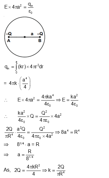 Let a total charge 2 Q be distributed in a sphere of radius R, with the charge density given by (r) = kr, where r is the distance from the centre. Two charges A and B, of –Q each, are placed on diametrically opposite points, at equal distance, a, from the centre. If A and B do not experience any force, then :