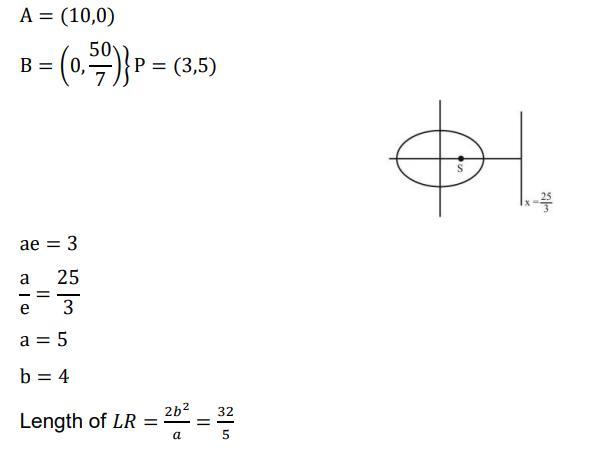 Let $A(\alpha, 0)$ and $B(0, \beta)$ be the points on the line $5 x+7 y=50$. Let the point $P$ divide the line segment $A B$ internally in the ratio $7: 3$. Let $3 x-25=0$ be a directrix of the ellipse $E: \frac{x^2}{a^2}+\frac{y^2}{b^2}=1$ and the corresponding focus be $S$. If from $S$, the perpendicular on the x -axis passes through P , then the length of the latus rectum of $E$ is equal to
