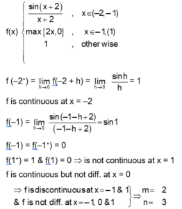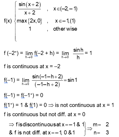 is the number of points where $f$ is not continuous and $n$ is the number of points where $f$ is not differentiable, then the ordered pair ( $m, n$ ) is :