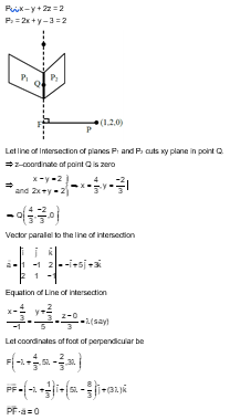 Let $L$ be the line of intersection of planes $\vec{r} \cdot(\hat{i}-\hat{j}+2 \hat{k})=2$ and $\vec{r} \cdot(2 \hat{i}+\hat{j}-\hat{k})=2$. If $P(\alpha, \beta, \gamma)$ is the foot of perpendicular on $L$ from the point $(1,2,0)$, then the value of $35(\alpha+\beta+\gamma)$ is equal to.