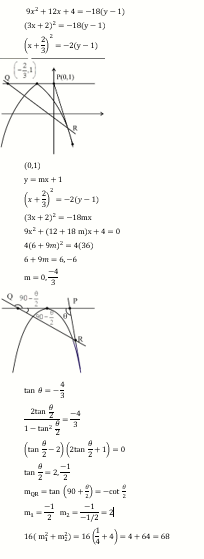 Let $L_1, L_2$ be the lines passing through the point $P(0,1)$ and touching the parabola $9 x^2+12 x+18 y- 14=0$. Let $Q$ and $R$ be the points on the lines $\mathrm{L}_1$ and $\mathrm{L}_2$ such that the $\triangle \mathrm{PQR}$ is an isosceles triangle with base $Q R$. If the slopes of the lines $Q R$ are $m_1$ and $m_2$. then $16\left(\mathrm{~m}_1^2+\mathrm{m}_2^2\right)$ is equal to $\_\_\_\_$ .