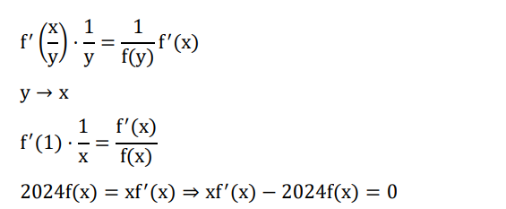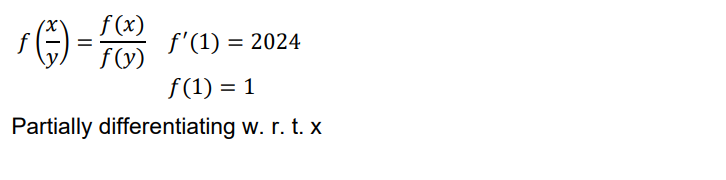 Let $\mathrm{f}: \mathbb{R}-\{0\} \rightarrow \mathbb{R}$ be a function satisfying $f\left(\frac{x}{y}\right)=\frac{f(x)}{f(y)}$ for all $x, y, f(y) \neq 0$. If $f^{\prime}(1)=2024$, then