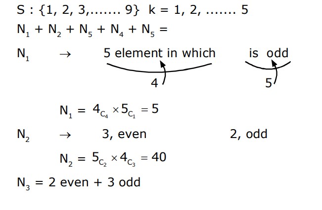 Let $\mathrm{S}=\{1,2,3, \ldots \ldots 9\}$. For $\mathrm{k}=1,2, \ldots \ldots, 5$, let $\mathrm{N}_{\mathrm{k}}$ be the number of subsets of S , each containing five elements out of which exactly $k$ are odd. Then $N_1+N_2+N_3+N_4+N_5=$