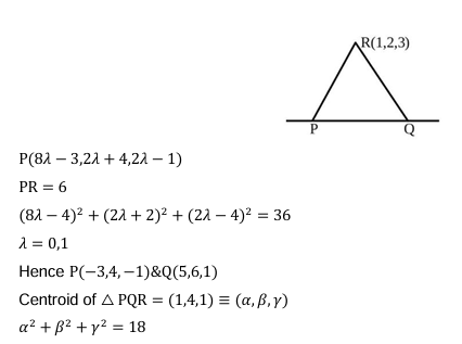 Let $P$ and $Q$ be the points on the line $\frac{x+3}{8}=\frac{y-4}{2}=\frac{z+1}{2}$ which are at a distance of 6 units from the point $\mathrm{R}(1,2,3)$. If the centroid of the triangle PQR is $(\alpha, \beta, \gamma)$, then $\alpha^2+\beta^2+\gamma^2$ is: