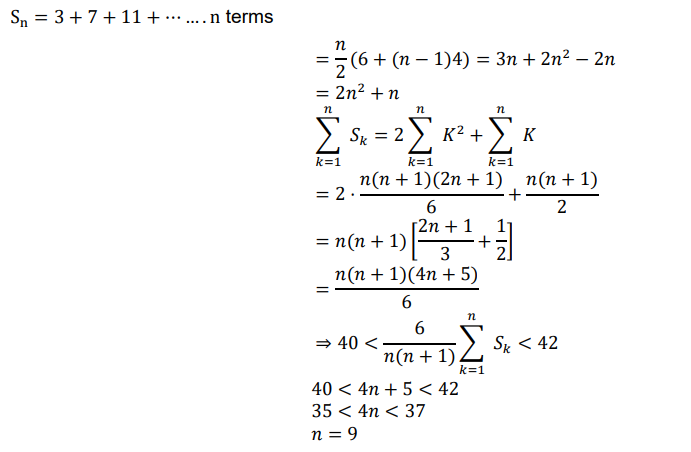 Let $S_n$ be the sum to $n$-terms of an arithmetic progression $3,7,11, \ldots \ldots$. If $40<\left(\frac{6}{\mathrm{n}(\mathrm{n}+1)} \sum_{\mathrm{k}=1}^{\mathrm{n}} \mathrm{S}_{\mathrm{k}}\right)<42$, then n equals