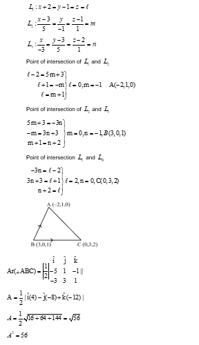 Let the area of the triangle formed by the lines $x+2=y-1=z, \frac{x-3}{5}=\frac{y}{-1}=\frac{z-1}{1}$ and $\frac{x}{-3}=\frac{y-3}{3}=\frac{z-2}{1}$ be $A$. Then $A^2$ is equal to $\_\_\_\_$ .