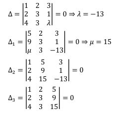 $$ \begin{aligned} & x+2 y+3 z=5 \\ & 2 x+3 y+z=9 \\ & 4 x+3 y+\lambda z=\mu \end{aligned} $$ for infinite following $\Delta=\Delta_1=\Delta_2=\Delta_3=0$