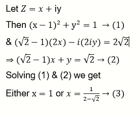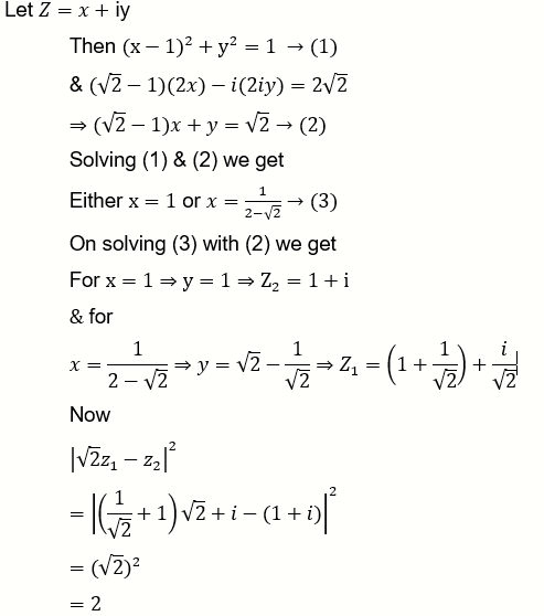 LetS $=\{z \in C:|z-1|=1$ and $(\sqrt{2}-1)(z+\bar{z})-i(z-\bar{z})=2 \sqrt{2}\}$. Let $z_1, z_2 \in S$ be such that $\left|z_1\right|= \max _{z \in S}|z|$ and $\left|z_2\right|=\min _{z \in S}|z|$. Then $\left|\sqrt{2} z_1-z_2\right|^2$ equals: