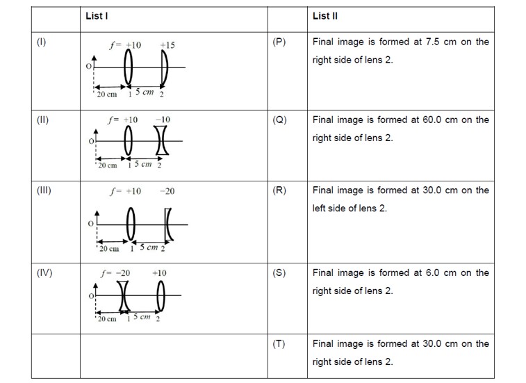 List I contains four combinations of two lenses (1 and 2) whose focal lengths (in cm) are indicated in the figures. In all cases, the object is placed 20 cm from the first lens on the left, and the distance between the two lenses is 5 cm. List II contains the positions of the final images.