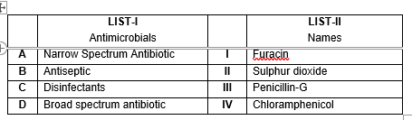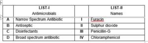 Sol. (A) Narrow spectrum antibiotic - penicillin-G (B) Antiseptic - Furacine (C) Disinfectants - sulphur dioxide (D) Broad spectrum antisiotics - chloramphenicol