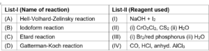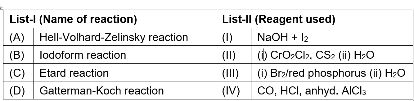 HVZ reactions = Br2 / red P lodoform reaction $=\mathrm{NaOH}+\mathrm{I}_2$ Etard reaction $=$ (i) $\mathrm{CrO}_2 \mathrm{Cl}_2, \mathrm{CS}_2$ (jii) $\mathrm{H}_2 \mathrm{O}$ Gatterman-Koch Reaction = CO, HCl, Anhydrous, $\mathrm{AlCl}_3$