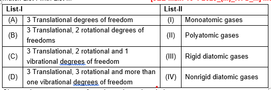 $$ \begin{array}{ll} \text { Sol. Type of gases } & \text { No. of degrees of freedom } \\ \text { Monoatomic gas } & 3 T \\ \text { Diatomic + rigid } & 3 T+2 R \\ \text { Diatomic + non-rigid } & 3 T+2 R+1 \mathrm{~V} \\ \text { Polyatomic } & 3 T+3 R+\text { More than } 1 \mathrm{~V} \end{array} $$