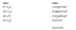 Match the electronic configurations in List-I with appropriate metal complex ions in List-II and choose the correct option. [Atomic Number: $\mathrm{Fe}=26, \mathrm{Mn}=25, \mathrm{Co}=27$ ]