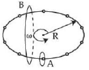 $N$ equally spaced charges each of value $q$, are placed on a circle of radius $R$. The circle rotates about its axis with an angular velocity $\omega$ as shown in the figure. A bigger Amperian loop B encloses the whole circle where as a smaller Amperian loop A encloses a small segment. The difference between enclosed currents, $\mathrm{I}_{\mathrm{A}}-\mathrm{I}_{\mathrm{B}}$, for the given Amperian loops is