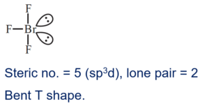 Number of lone pair (s) of electrons on central atom and the shape of $\mathrm{BrF}_3$ molecule respectively, are.