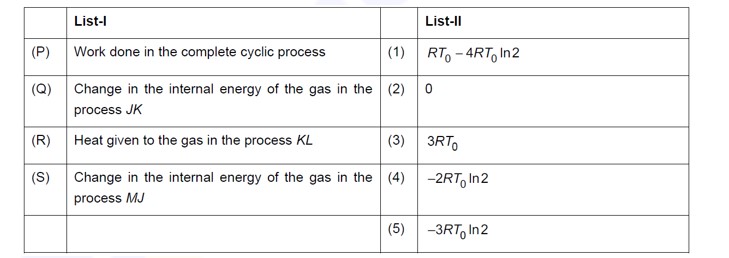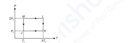 One mole of a monatomic ideal gas undergoes the cyclic process $J \rightarrow K \rightarrow L \rightarrow M \rightarrow J$, as shown in the $P-T$ diagram.