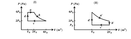 One mole of an ideal gas undergoes two different cyclic processes I and II, as shown in the $P-V$ diagrams below. In cycle I, processes $a, b, c$ and $d$ are isobaric, isothermal, isobaric and isochoric, respectively. In cycle II, processes $a^{\prime}, b^{\prime}, c^{\prime}$ and $d^{\prime}$ are isothermal, isochoric, isobaric and isochoric, respectively. The total work done during cycle $I$ is $W_I$ and that during cycle $I I$ is $W_{I l}$. The ratio $W_I / W_{I l}$ is $\_\_\_\_$ .