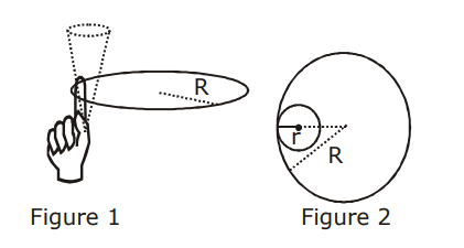 One twirls a circular ring (of mass $M$ and radius $R$ ) near the tip of one's finger as shown in figure 1. In the process the finger never loses contact with the inner rim of the ring. The finger traces out the surface of a cone, shown by the dotted line. The radius of the path traced out by the point where the ring and the finger is in contact is $r$. The finger rotates with an angular velocity $\omega_0$. The rotating ring rolls without slipping on the outside of a smaller circle described by the point where the ring and the finger is in contact (Figure2). The coefficient of friction between the ring and the finger is $\mu$ and the acceleration due to gravity is g .