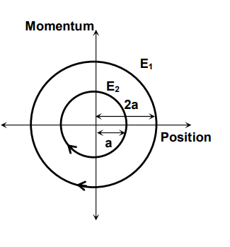 The phase space diagram for simple harmonic motion is a circle centered at the origin. In the figure, the two circles represent the same oscillator but for different initial conditions, and $\mathrm{E}_1$ and $\mathrm{E}_2$ are the total mechanical energies respectively. Then