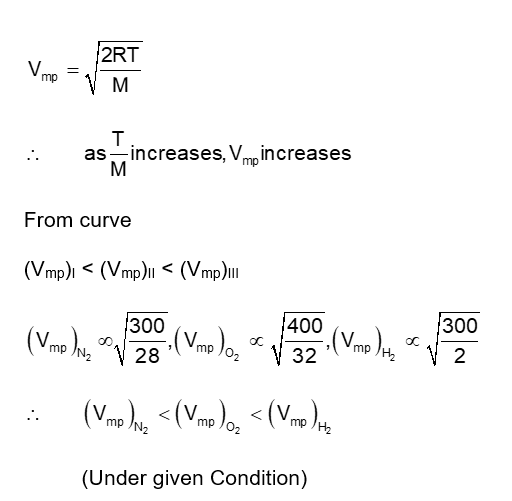 $\mathrm{V}_{\mathrm{mp}}$ of $\mathrm{N}_2(300 \mathrm{~K}) ; \mathrm{V}_{\mathrm{mp}}$ of $\mathrm{O}_2(400 \mathrm{~K}) ;$ $\mathrm{V}_{\mathrm{mp}}$ of $\mathrm{H}_2(300 \mathrm{~K})$