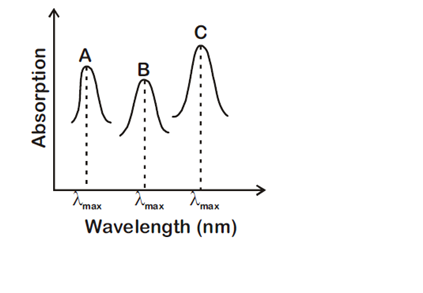 Simplified absorption spectra of three complexes ((i), (ii) and (iii)) of $\mathrm{M}^{n^{+}}$ion are provided below; their $\lambda_{\max }$ values are marked as A , B and C respectively. The correct match between the complexes and their $\lambda_{\max }$ values is