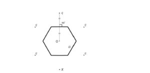 Six charges are placed around a regular hexagon of side length 𝑎 as shown in the figure. Five of them have charge 𝑞, and the remaining one has charge x. The perpendicular from each charge to the nearest hexagon side passes through the center O of the hexagon and is bisected by the side. Which of the following statement(s) is (are) correct in SI units?