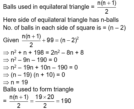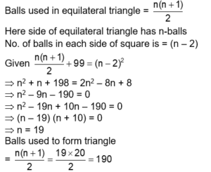 Some identical balls are arranged in rows to form an equilateral triangle. The first row consists of one ball, the second row consists of two balls and so on. If 99 more identical balls are added to the total number of balls used in forming the equilateral triangle, then all these balls can be arranged in a square whose each side contains exactly 2 balls less than the number of balls each side of the triangle contains. Then the number of balls used to form the equilateral triangle is :