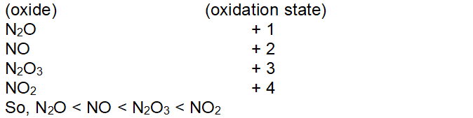 $\mathrm{N}_2 \mathrm{O}<\mathrm{N}_2 \mathrm{O}_3<\mathrm{NO}<\mathrm{NO}_2$
